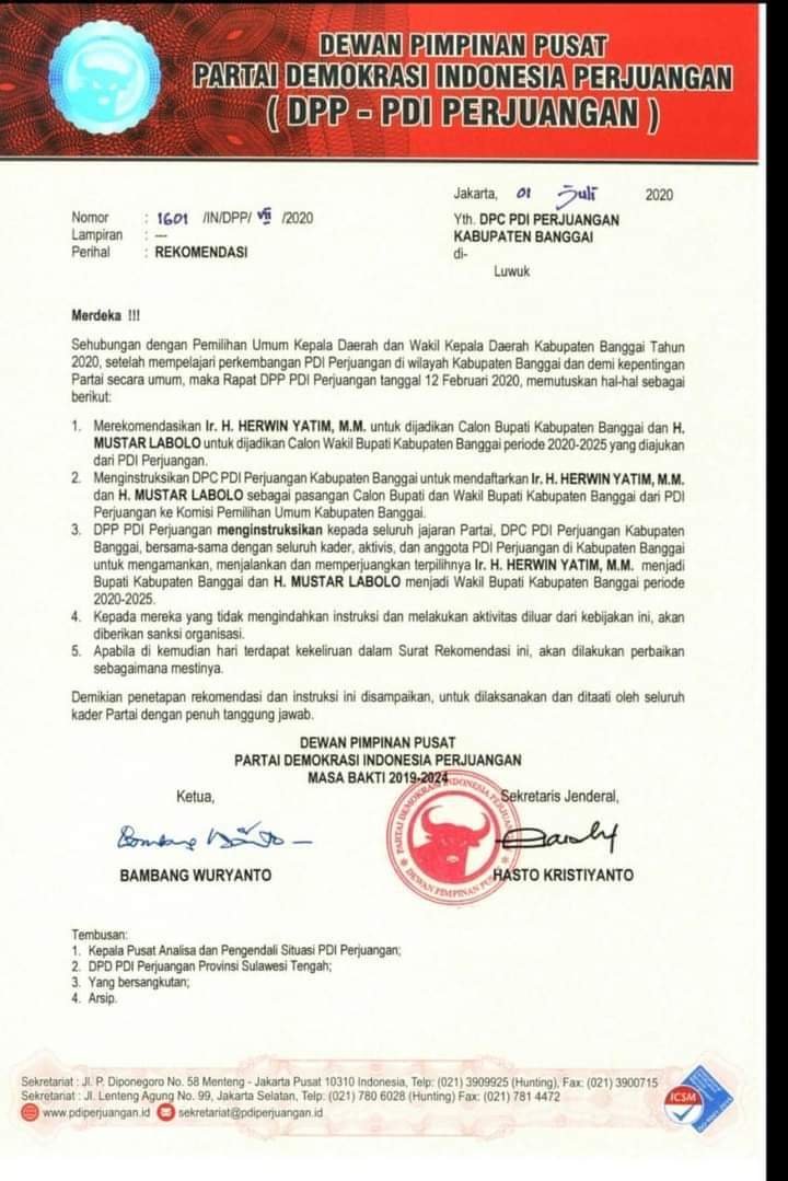 SultimNews, LUWUK-Dewan Pimpinan Pusat (DPP) Partai Demokrasi Indonesia (PDI) Perjuangan, mengeluarkan surat rekomendasi kepada Herwin Yatim-Mustar Labolo (Winstar), sebagai calon bupati dan wakil bupati, pada Pilkada Banggai 2020.