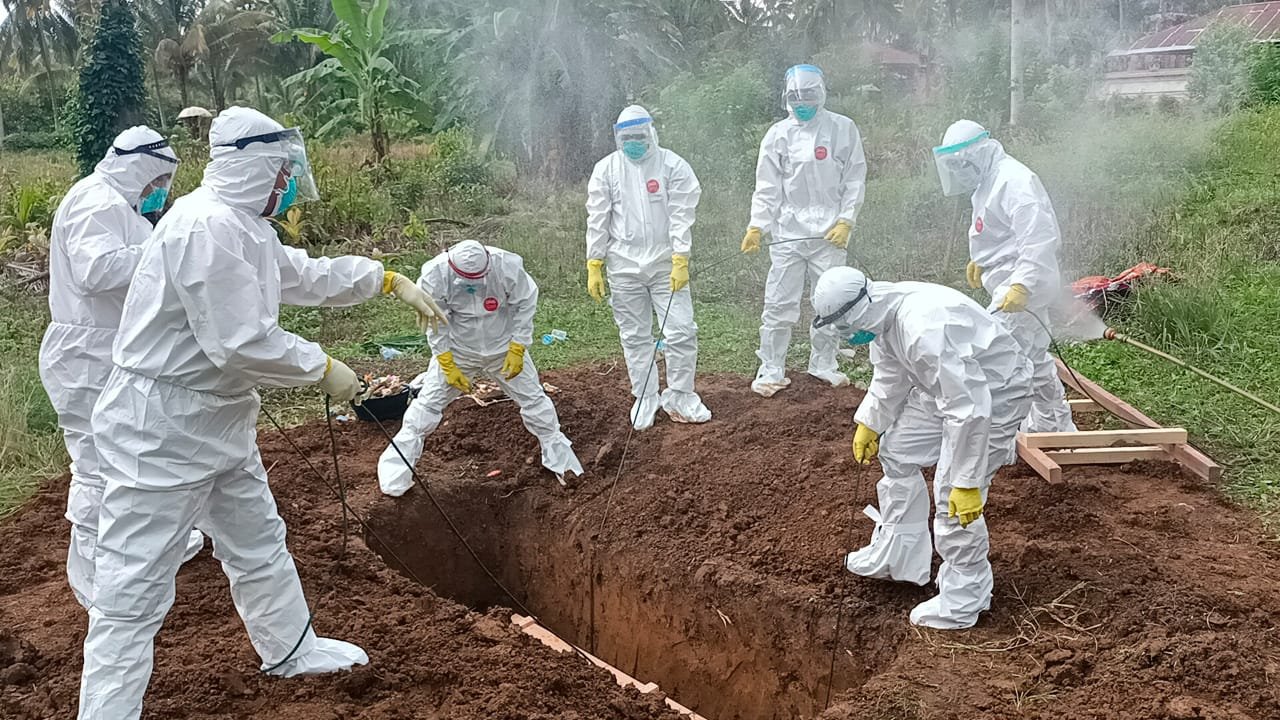 Pemakaman tersebut seluruh tim tetap menerapkan aturan dan tata cara pemakaman jenazah Covid-19 dengan menggunakan alat pelindung diri lengkap.