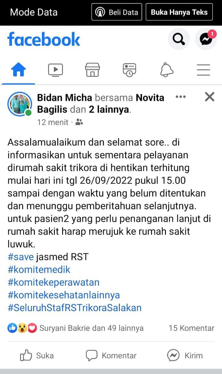 “Assalamualaikum dan selamat sore.. di informasikan untuk sementara pelayanan dirumah sakit trikora di hentikan terhitung mulai hari ini tgl 26/09/2022 pukul 15.00 sampai dengan waktu yang belum ditentukan,” demikian pengumuman yang beredar via media sosial warga Bangkep.