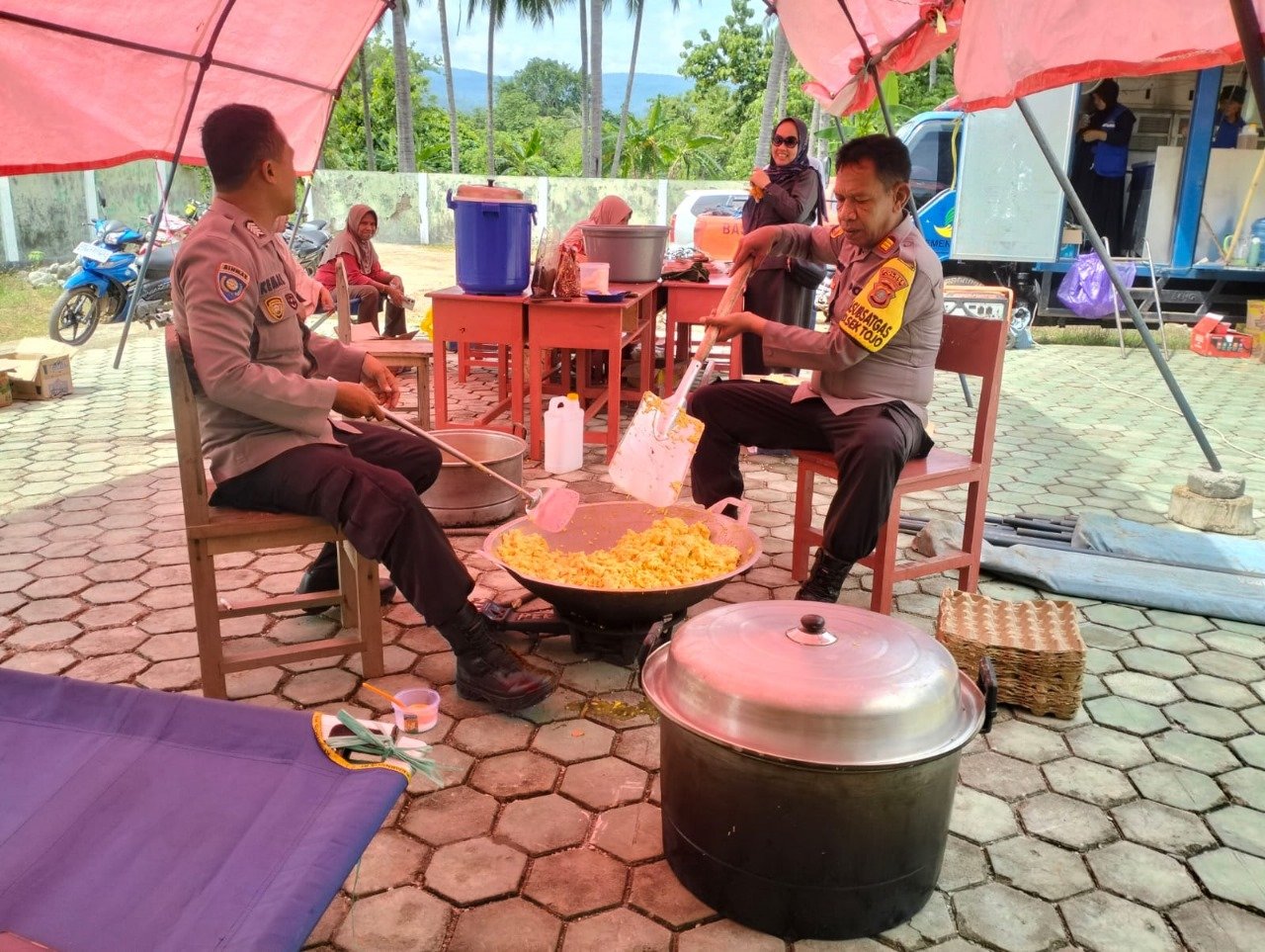 Sebagai bentuk kepedulian terhadap warga yang terdampak banjir, Anggota Polsek Tojo bersama Brimob Kompi Marowo terjun langsung untuk menyiapkan makanan di Dapur Umum yang didirikan di Madrasah Diniyah Awaliyah (MDA) Desa Tayawa.