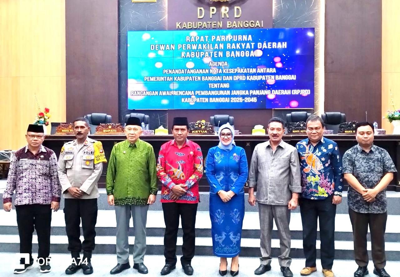 LUWUK, SULTIMNEWS.id — DPRD bersama Pemerintah Daerah Kabupaten Banggai melaksanakan Rapat Paripurna penandatanganan nota kesepakatan Rancangan Awal (Ranwal) Rencana Pembangunan Jangka Panjang Daerah (RPJD) Kabupaten Banggai Tahun 2025-2045, bertempat di Ruang Rapat Utama Kantor DPRD Banggai, Senin (19/2/2023).