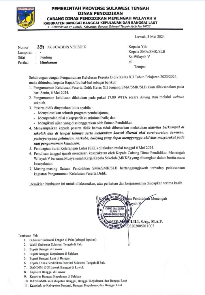 Sebagaimana disebutkan dalam surat edaran himbauan Nomor 389/061/CABDIS.V/DISDIK, yang dikeluarkan oleh Dinas Pendidikan Cabang Dinas Pendidikan Menengah Wilayah V, Kabupaten Banggai, Banggai Kepulauan dan Banggai Laut, pada Jumat, 3 Mei 2024.