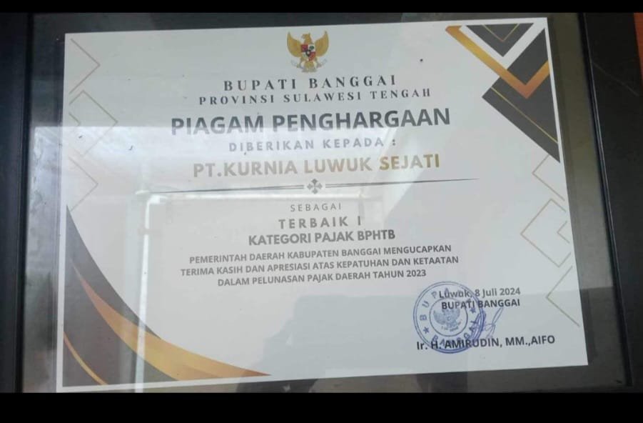 Penghargaan kepada perusahaan yang dipimpin Hj.Sulianti Murad itu, ditandatangani Bupati Bangai tertanggal 8 Juli 2024.