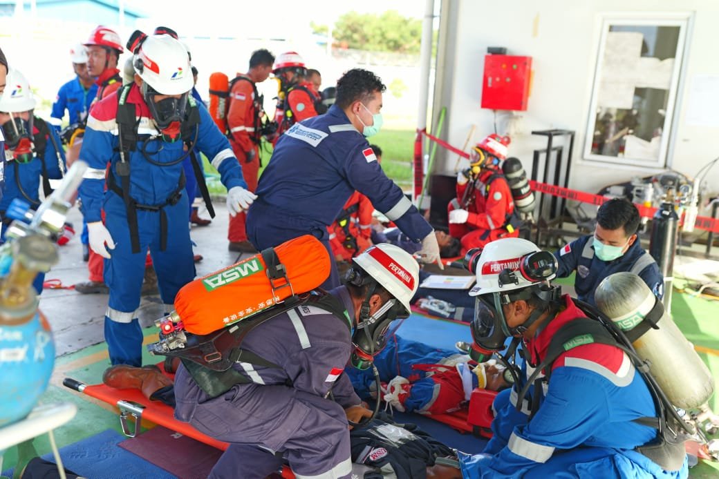 Emergency drill ini melibatkan skenario kebocoran gas H2S di area manifold, mengakibatkan 6 orang korban, dengan jumlah tenaga medis yang tersedia sebanyak 4 orang.